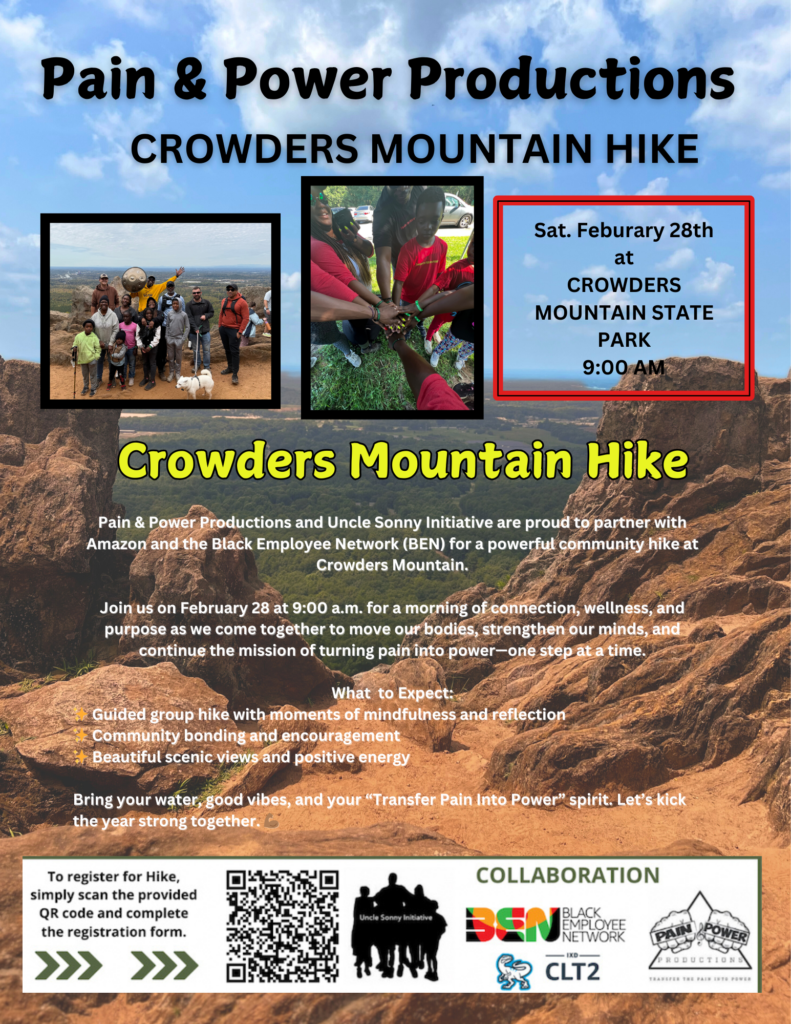 Pain & Power Productions and the Uncle Sonny Initiative are proud to partner with Amazon and the Black Employee Network (BEN) for a powerful community hike at Crowders Mountain. Join us on February 28 at 9:00 a.m. for a morning of connection, wellness, and purpose as we come together to move our bodies, strengthen our minds, and continue the mission of turning pain into power—one step at a time.